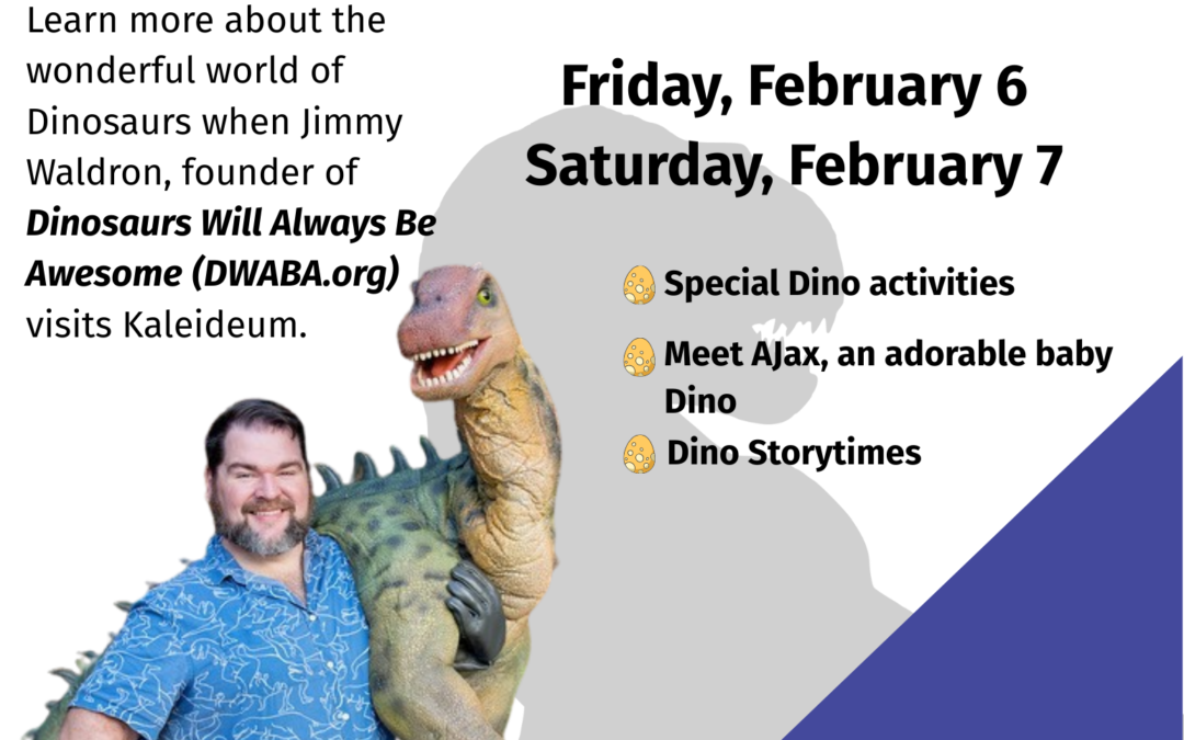 During this $5 Friday Night, learn more about the wonderful world of dinosaurs with special guest Jimmy Waldron, founder of Dinosaurs Will Always Be Awesome (DWABA.org). Waldron will be visiting with Ajax, an adorable baby Apatosaurus! He will give a Dino Talk at 4 pm (Paleontology Skills & Drills) during regular hours and one at 6:30 pm (Your Dinosaur Phase and You) during $5 Friday.