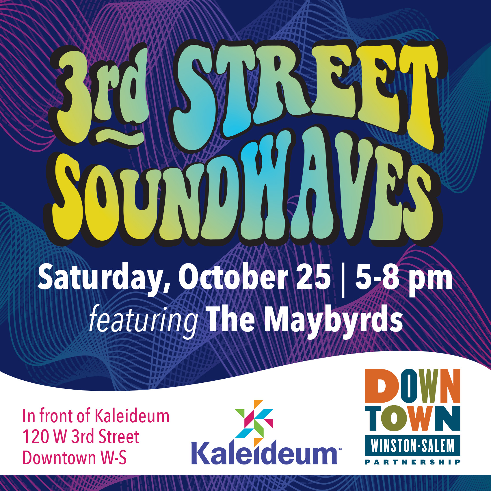 Kaleideum 120 W 3rd Street, Winston-Salem, NC, United StatesWe're wrapping up Ghoul Times outside the museum with the 3rd Street Soundwaves concert series! Bring your lawn chair and get ready for an evening of great music and dancing in collaboration with the Downtown Winston-Salem Partnership. This free outdoor concert features The Maybyrds. Beer and wine will be available for purchase.