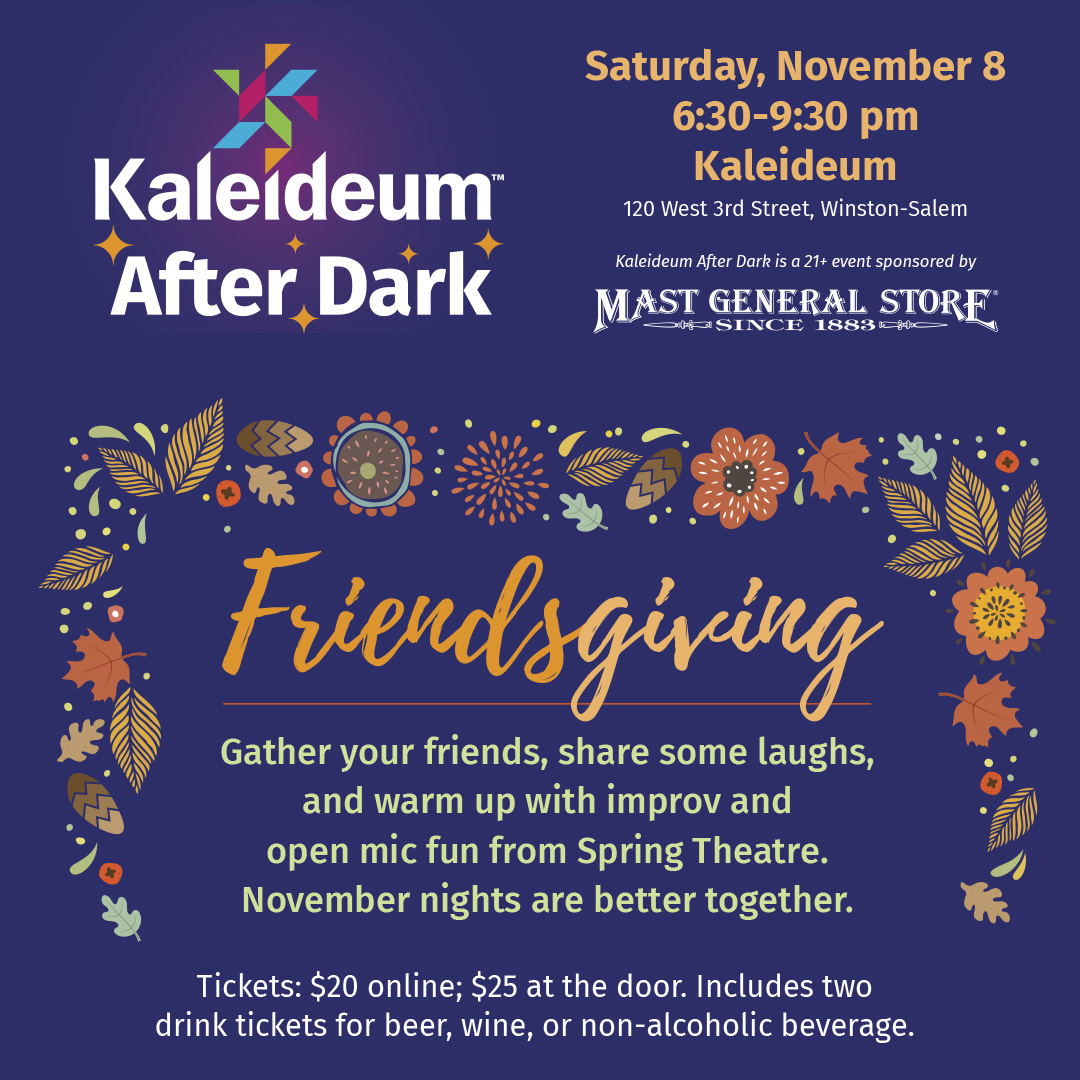 Kaleideum 120 W 3rd Street, Winston-Salem, NC, United StatesThere’s a chill in the air, and the holidays are just around the corner — the perfect time to gather your crew for a night of laughter and fun! November is better with friends, especially when they’re bringing the jokes, the improv, and the unexpected. Spring Theatre takes the lead at this 21+ Kaleideum After […]