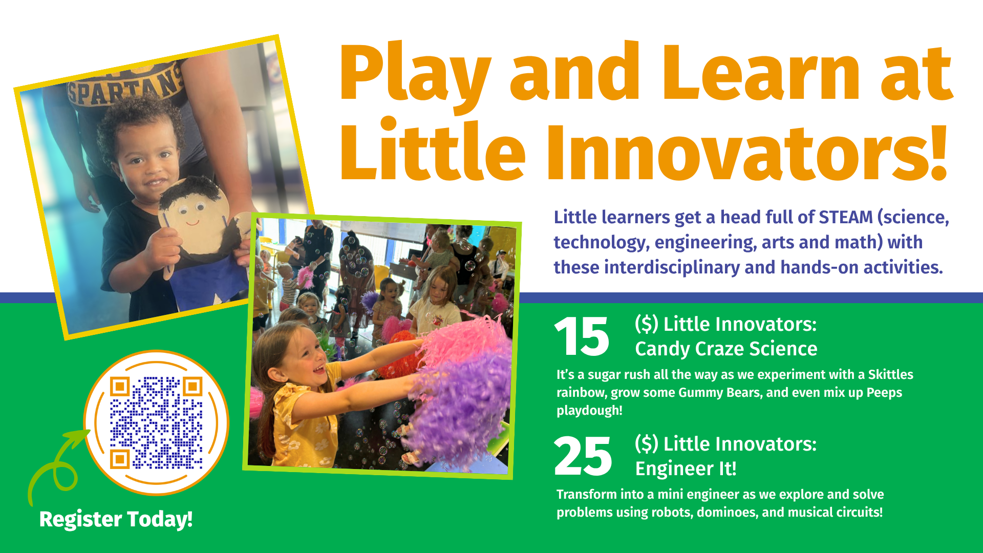 Little Innovators is a hands-on program for young children that sparks creativity and curiosity through fun stories, art, and science activities.